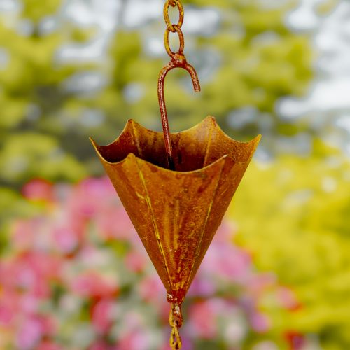 Add movement, sound, and sculptural charm to your garden with this 78-inch Iron Umbrella Rain Chain in an antique rust finish. Designed to guide rainwater gracefully from gutters to the ground, this decorative accent transforms ordinary rainfall into a calming, eye-catching feature.