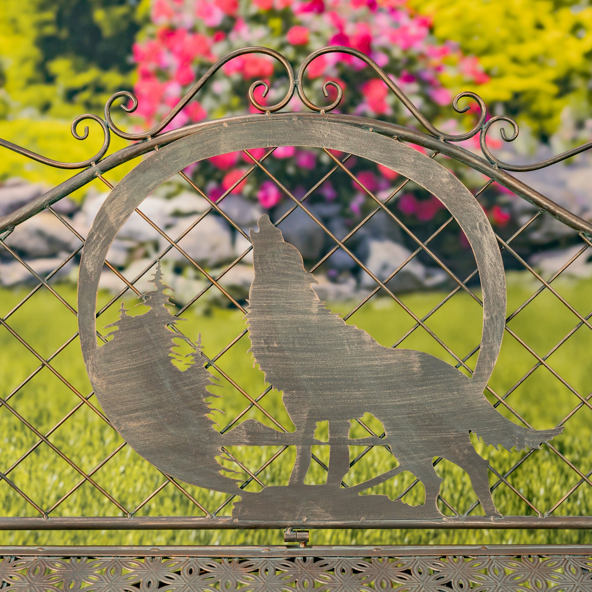 Classic Iron Garden Bench with Howling Wolf & Moon – “Gunnison”