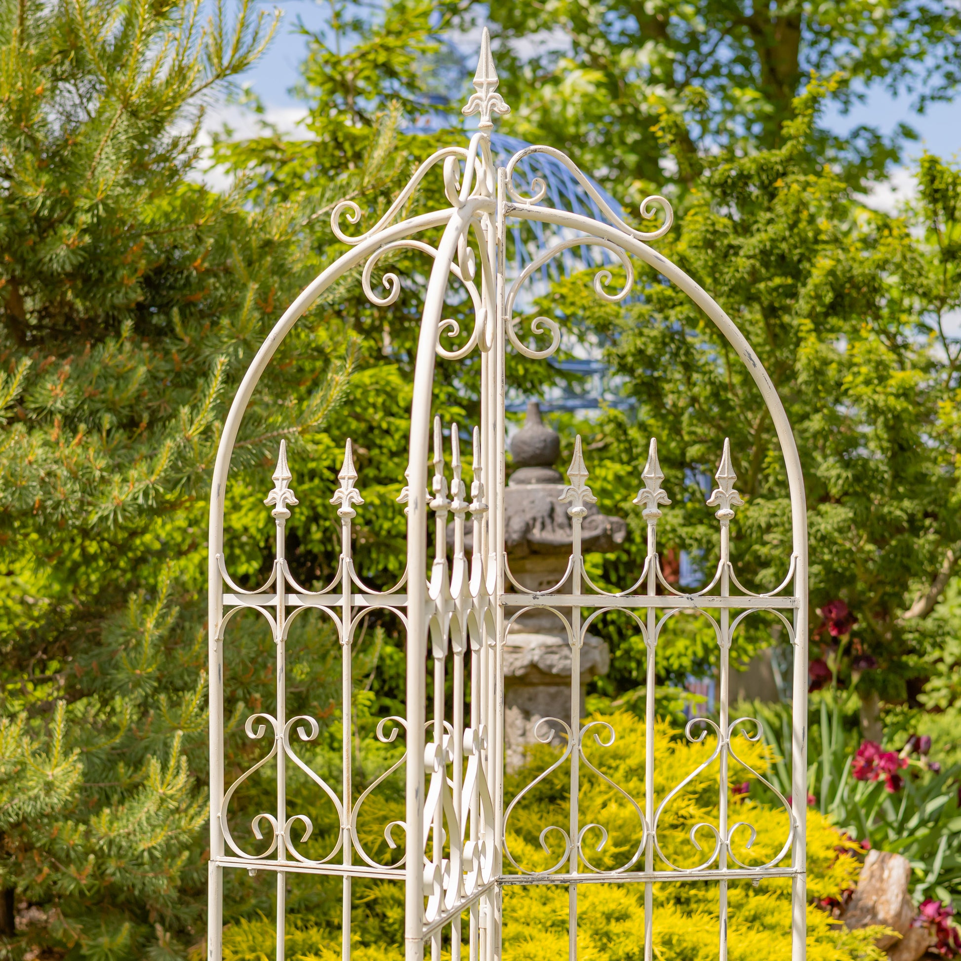 Crafted from durable powder-coated iron with a distressed hand-painted finish, this trellis is designed for long-lasting outdoor use. Three ground stakes provide freestanding stability, making it ideal for garden beds, patios, and courtyard settings. Its classic fleur-de-lis detailing creates a refined focal point that elevates both traditional and cottage-style landscapes.