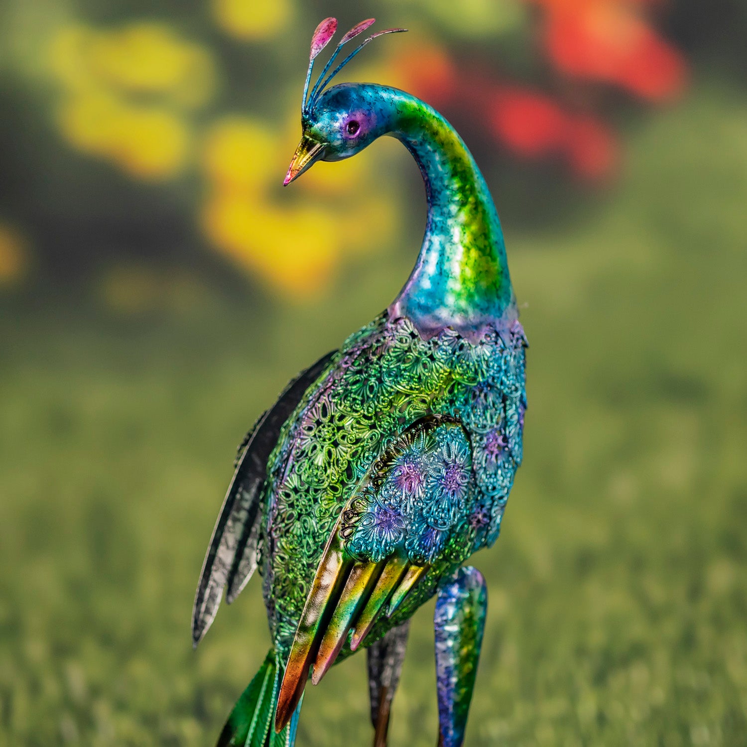 Each sculpture is skillfully crafted from durable iron and hand-painted in a shimmering blue-green metallic finish. Their flowing tails and decorative crest feathers feature an iridescent overlay that catches sunlight beautifully, creating dimension and subtle color shifts throughout the day.